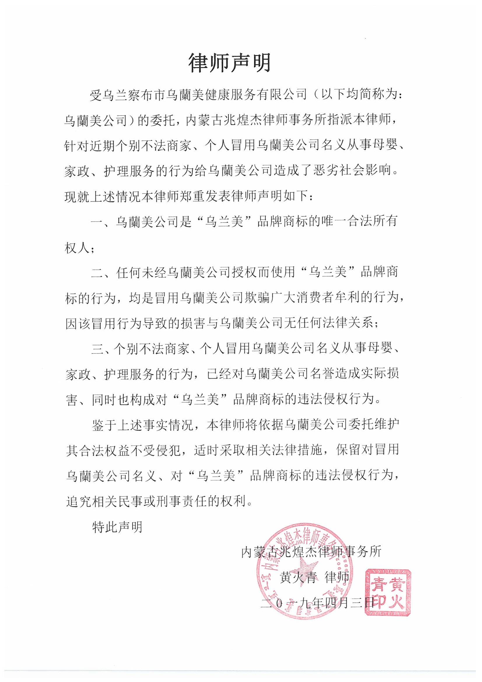 針對近期個別不法商家、個人冒用烏蘭察布市烏蘭美健康服務有限公司名義從事母嬰、家政、護理服務的行為,給公司造成了惡劣的社會影響?,F公司委托內蒙古兆煌杰律師事務所黃火青律師,發(fā)表律師聲明如下: