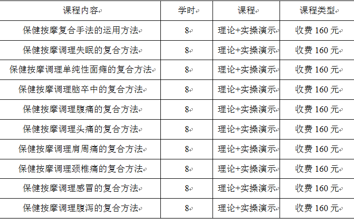 課程安排:保健按摩特色課程以中醫(yī)基礎為主,收費1380元【共十天,課程詳情見上圖】,單項培訓依據課程大綱價格而定,單項160元/節(jié),不可享受優(yōu)惠。參加培訓學員食、宿、交通費自理。